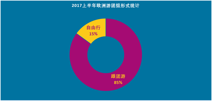 据携程旅行网、华远国旅交易数据显示,2017年上半年中国游客赴欧洲旅游人次同比增长65%。其中跟团游实现了81%的高增长,目的地跟团游增长翻番,增长率达103%。跟团游依然是欧洲游的主要方式,有85%的国人选择了跟团方式。尽管选择自由行的中国游客占比仅为15%,但增长速度较快,自由行游客规模同比增长了26%。